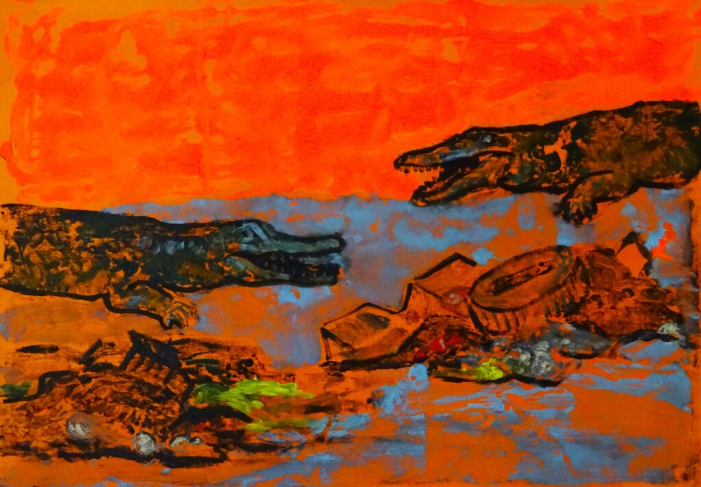 Присъствието на животните в композицията е сюрреално. Конете стъпват объркано насред междублоковия пейзаж и в тропота им отеква фовизма на сините коне на Франц Марк. Измежду техните копита се въргаля том на Бодлер, чиято вдъхновяваща мощ, авторката не е забравила да почете. Може би именно бунтарския дух на символизма е накарал един от същите тези коне да се обърне озъбен към нас – зрителя, наблюдаващ от удобството на белия куб, и да разбие четвъртата му стена. В обърканите погледи на животните, търсещи прехрана в останките от нашия бит, откриваме същия неутолим глад и усещане за изгубеност, които изпитваме и ние в света, който сами създадохме за себе си. Единственото изключение е, че животните са невинните потърпевши – тези, които се приспособяват към средата, която сме им отнели и егоцентрично нагодили към самите себе си. Ние сме тези, които са ги принудили да се превърнат от ловци и тревопасни в вехтошари. Техниката на маслената монотипията още повече добавя към идеята за отпечатъка на човешката дейност върху лицето на природата.